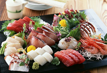 其次,刺身常用的材料是魚,而且是新鮮的魚。常見的有金槍魚、鯛魚、比目魚、鰹魚、三文魚、鱸 魚、鯔魚等海魚;也有鯉魚、鯽魚等淡水魚。在古代,鯉魚曾經(jīng)是做刺身的好原料,而現(xiàn)在呢?刺身已經(jīng)不限于魚類原料了,像螺蛤類(包括螺肉、牡蠣肉和鮮貝),蝦和蟹,海參和海膽,章魚、魷魚、墨魚、鯨魚,還有雞肉、鹿肉和馬肉,都可以成為制作刺身的原料。在日本,吃刺身還講究季節(jié)性。春吃北極貝、象拔蚌、海膽(春至夏初);夏吃魷魚、鱺魚、池魚、鰹魚、池魚王、劍魚(夏末秋初)、三文魚(夏至冬初);秋吃花鰱(秋及冬季)、鰹魚;冬吃八爪魚、赤貝、帶子、甜蝦、鱺魚、章紅魚、油甘魚、金槍魚、劍魚(有些魚我們國家還沒有)。