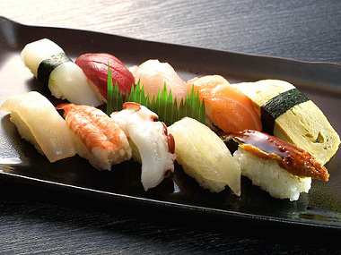 壽司是在飯里放醋做主材料的日本料理,壽司和其他日本料理一樣,色彩非常鮮明。制作時,把新鮮的海膽黃,鮑魚,牡丹蝦,扇貝,鮭魚籽,鱈魚魚白,金槍魚,三文魚等海鮮切成片放在雪白香糯的飯團上,一揉一捏之后再抹上鮮綠的芥末醬,最后放到古色古香的瓷盤中……如此的色彩組合,是真正的“秀色可餐”。 吃壽司,講究的是食用的完整,就是整塊壽司要一口吃下,唯其如此,才能真正的品味出壽司的美味,壽司的飯香與生魚片的香味才能完全相融,將齒頰間填得滿滿,不留一絲縫隙,那濃香的滋味無處可逃,在口中久久徘徊,一波三折。