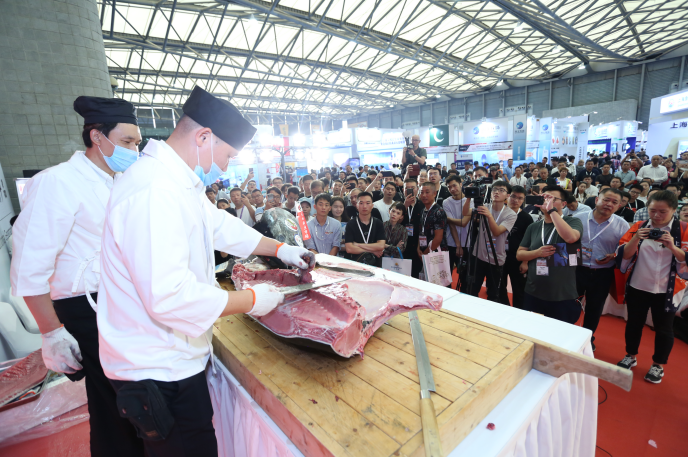 展期,上海大菱還在W3館舉行了冰鮮日本藍(lán)鰭金槍魚解體秀,活動(dòng)區(qū)現(xiàn)場(chǎng)人頭攢動(dòng),大家爭(zhēng)先恐后,一同見證了這場(chǎng)華麗而充滿儀式感的金槍魚人氣表演,在金槍魚刺身試吃環(huán)節(jié),面對(duì)這十分難得的體驗(yàn),觀眾直呼“非常難得的經(jīng)歷,一飽眼福和口福”。上海大菱還在展會(huì)上對(duì)大洋世家旗下餐飲品牌:鮨東、鮪殿、鮪洋、魚上岸等作了概念呈現(xiàn)。同時(shí),上海大菱也借此機(jī)會(huì),對(duì)來自Cermaq供應(yīng)的“真北極”三文魚(Ture arctic Salmon)進(jìn)行了展出推介?!罢姹睒O”三文魚,來自Cermaq在北極圈的漁場(chǎng),以高品質(zhì)、安全美味的產(chǎn)品定位相對(duì)高端的市場(chǎng)。